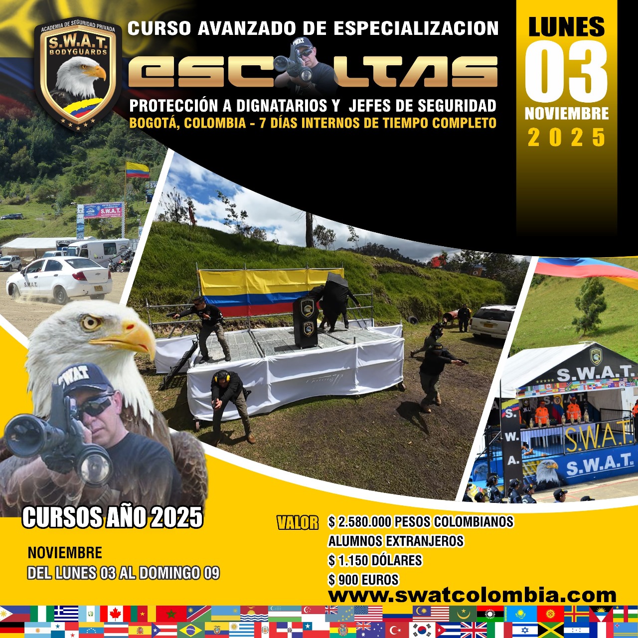 En SWAT Bodyguards, nuestra misión es formar profesionales de la seguridad altamente capacitados, éticos y operativos, mediante un entrenamiento táctico intensivo, realista y legalmente respaldado. Nos dedicamos a profesionalizar escoltas y agentes de protección que no solo dominan técnicas avanzadas de defensa, conducción evasiva, tiro, primeros auxilios y reacción operativa, sino que también actúan con disciplina, responsabilidad legal y compromiso con la vida humana.